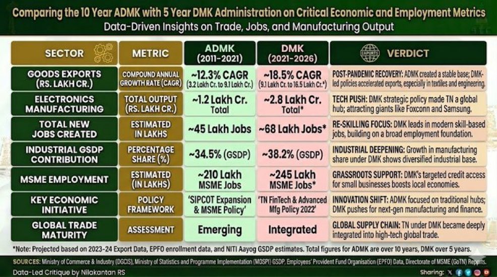 DMK's manifesto reads like a government that has a macroeconomic strategy — and a track record to base it on. Between 2021 and 2026, the state's GSDP grew 64%, exports doubled, FDI rose 241%, and manufacturing growth hit 14.74%. The manifesto builds from this base: ₹18 lakh crore in foreign investment, exports at $120 billion, 50 lakh new jobs with a commitment to 50,000 new industrial jobs per district, semiconductor investment worth ₹50,000 crore, 500 new GCCs, IT exports doubling to ₹5 lakh crore. There are sector-specific industrial corridors, 50 new SIPCOT parks (building on 33 already delivered), 10 Mega Plug & Play Parks, an Export Cell, trade offices in Southeast Asia, South America, and the Middle East. The MSME section alone has 24 detailed policy points with regional cluster strategies mapped to specific districts — from Ambur leather (₹40 crore) to Nilgiri tea brands to Krishnagiri mango GI missions. This is what a manifesto looks like when the party writing it has already built 31 lakh jobs through SIPCOT in the previous term.
