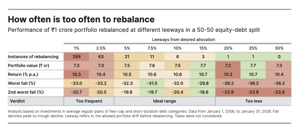Value Research ran a detailed analysis across every major market cycle from 2006 to 2026, testing how much leeway to allow before rebalancing a 50:50 equity-debt portfolio: